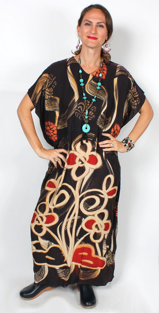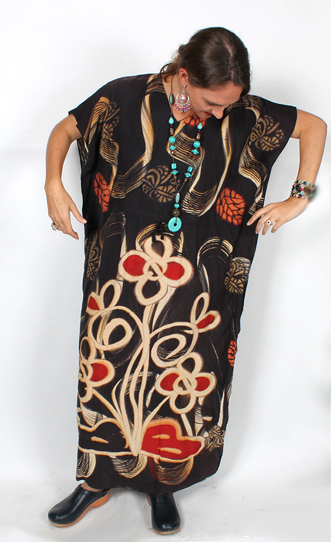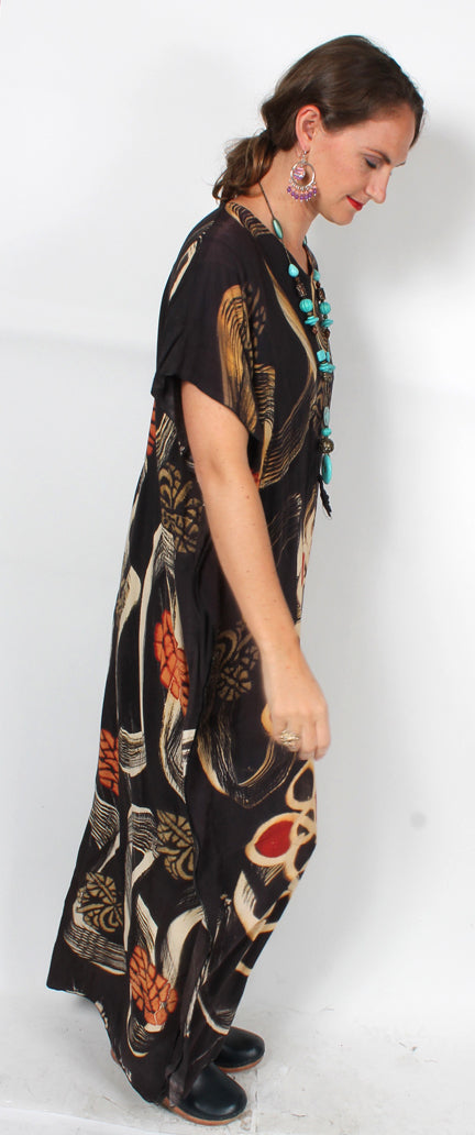 Size GuideRAYON MACH WASHONE SIZE FITS SMALL-2X+• Bust 48"• Hips 48"• Length 50"This one-of-a-kind caftan is a bold celebration of movement and presence, featuring a striking graphic aesthetic that flows across...