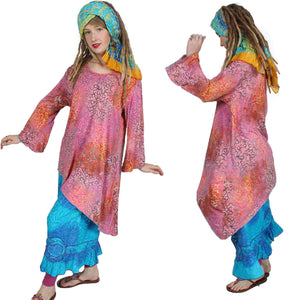 Size GuideBatik Stretch Only One Fun Top Slip into effortless comfort and joyful color with this one-of-a-kind batik top! Hand-dyed in deep jewel tones of teal, plum, and rust, the spiraling...