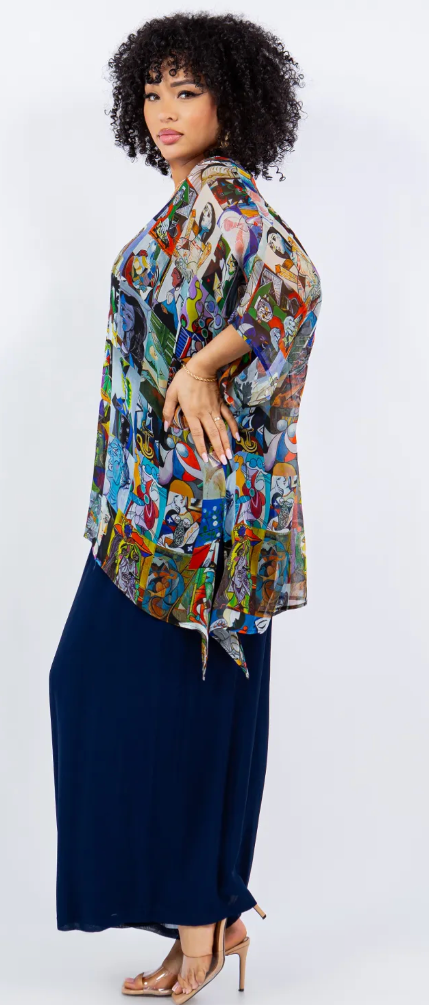Size GuidePoly-Rayon HAND-WASH LINE DRYONE SIZE FITS SML-6X • Bust 76"• Upper Arm 30"• Hips 74" • Length 29" - 38" Design Details: Scoop neck, three-quarter length sleeves oversize cover-up top in...