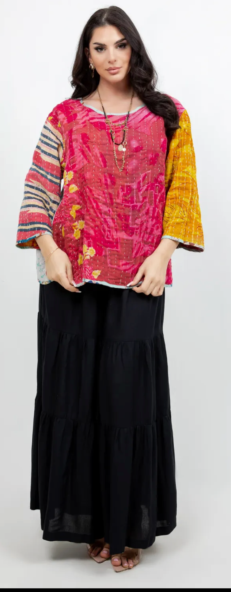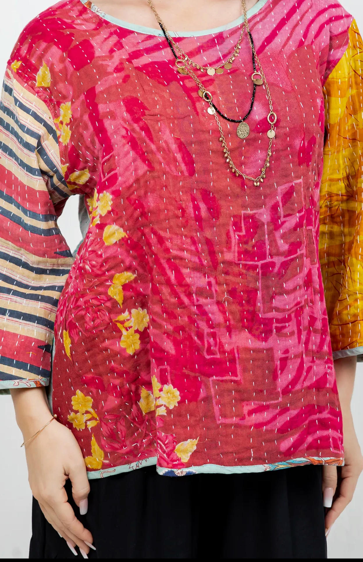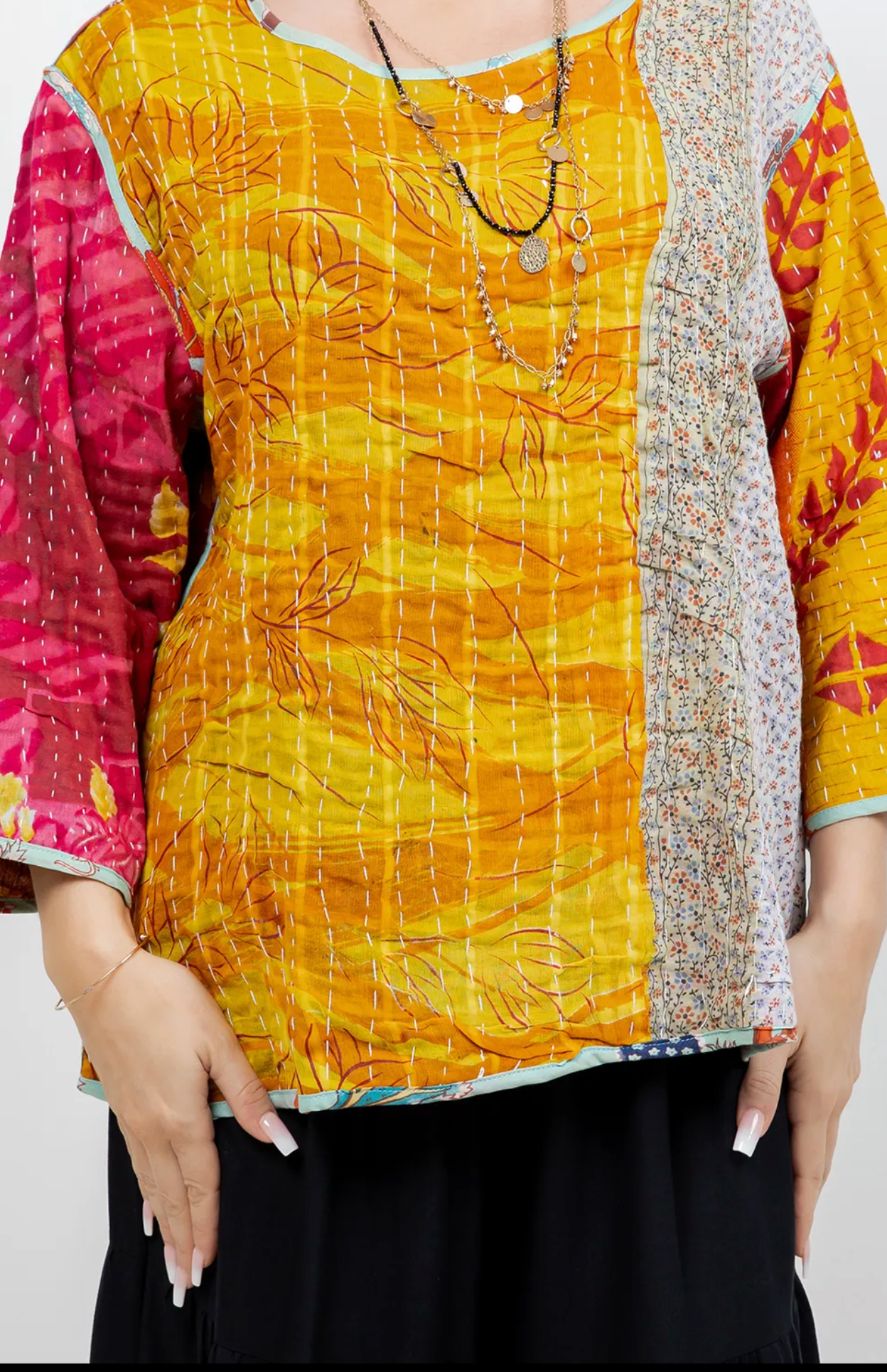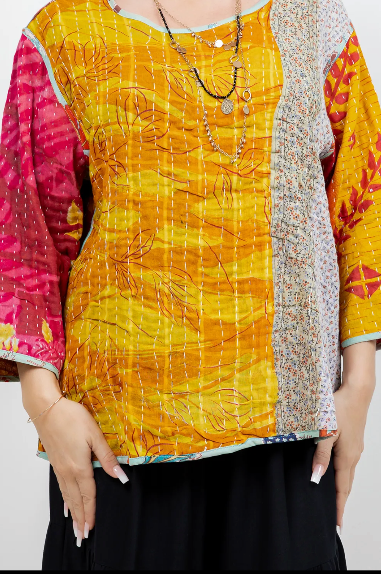 Size GuideCOTTON Bust 50" Hips 54+" Length 27.5" 🧵 Design Details: Kantha Patchwork Tunic This Sausalito Kantha Tunic is a one-of-a-kind wearable art piece crafted from vintage cotton saris. Each tunic...