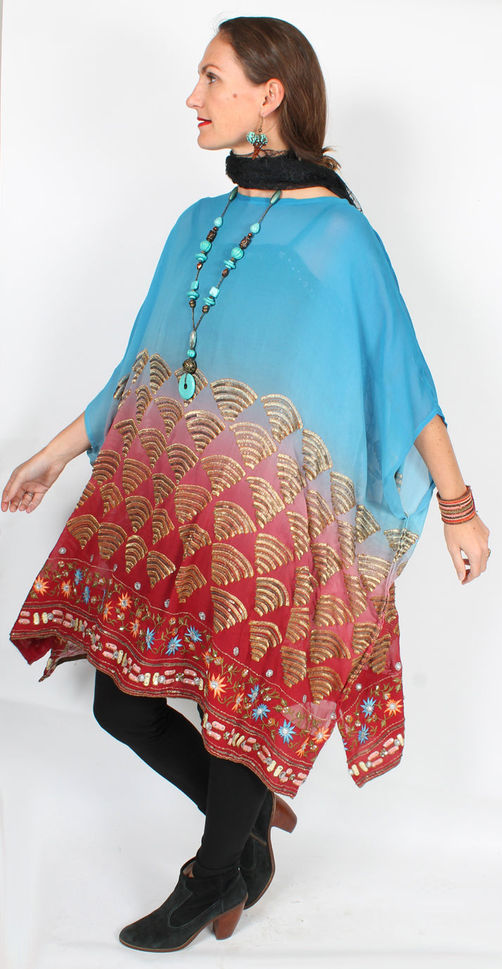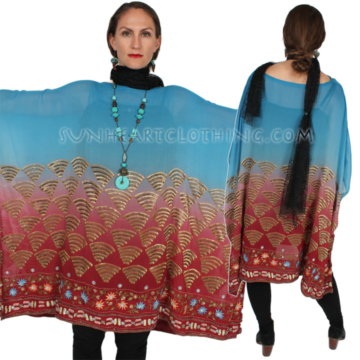 Size GuideSunHeart: vintage Silk Ruana embroidered beaded floral 100% SILK DRY CLEAN ONE SIZE FITS SML-9X Bust 90" wingspan• Hips 90"• Length 42"We have had our heads to the design board,...