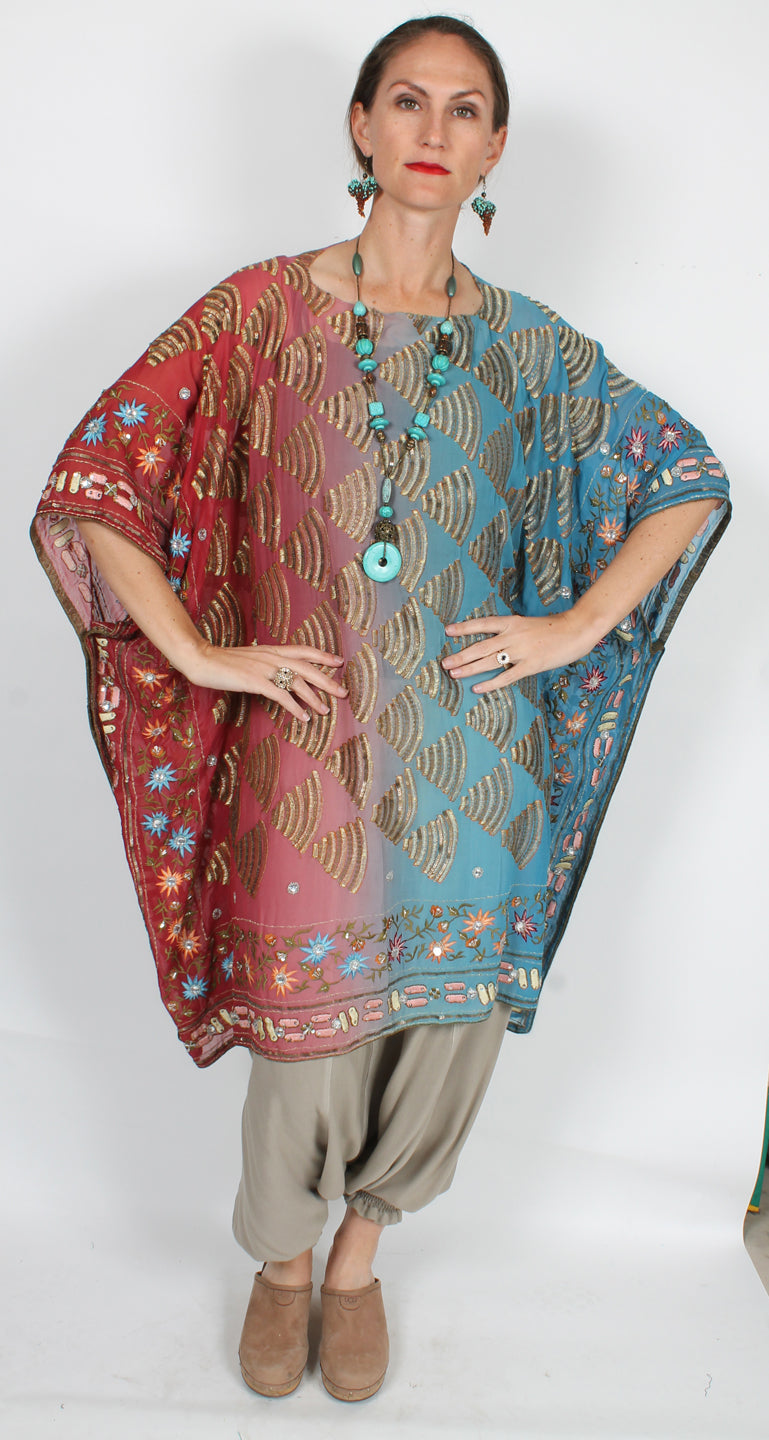 Size GuideSunHeart: vintage metal embroidered Silk Caftan 100% VINTAGE SILK ONE SIZE FITS SML-7X • Bust 88" • Hips 88" • Length 36" Another one-of-a-kind stunning caftan using vintage embroidered and...