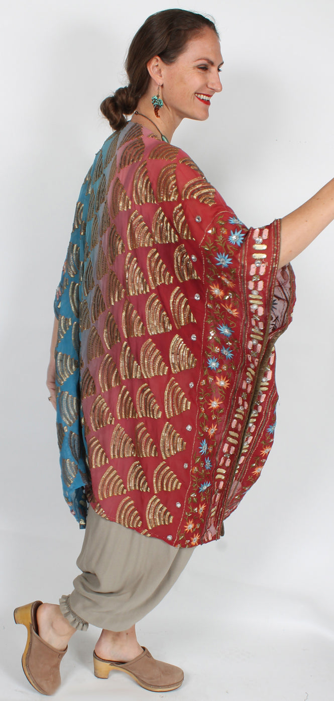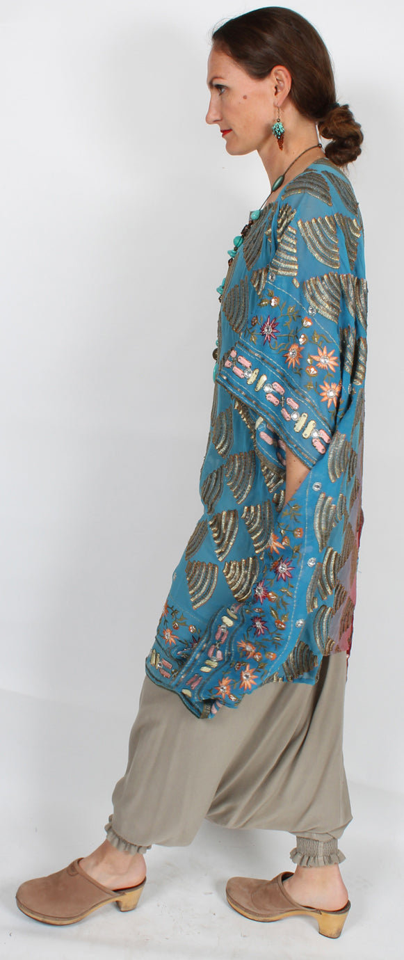 Size GuideONE-OF-A-KIND SunHeart: Silk Coat embroidered beaded floral 100% SILK DRY CLEAN ONE SIZE FITS SML-9X Bust 62" • Hips 64" • Length 41"We have had our heads to the design board, for our...