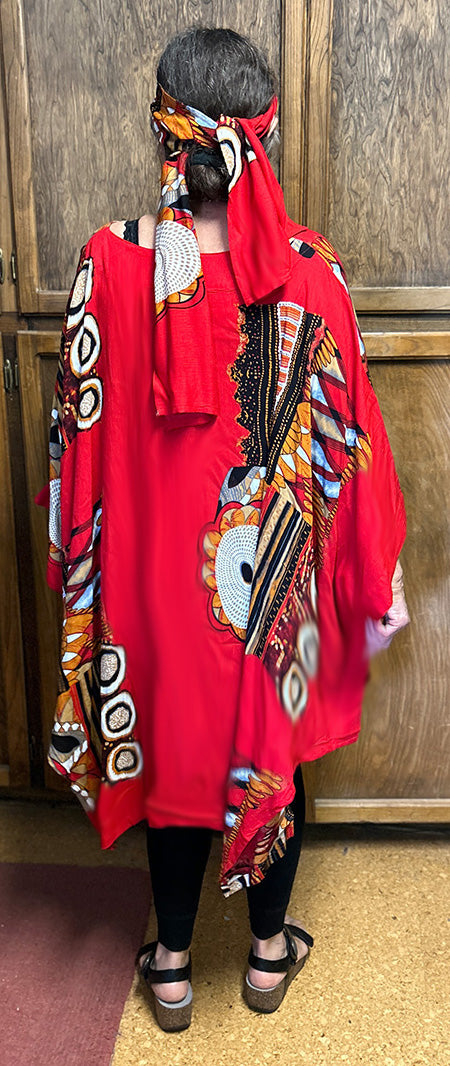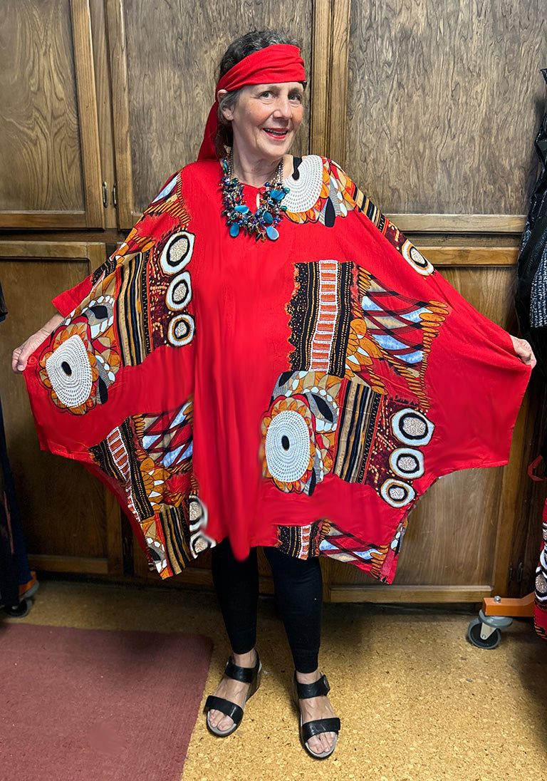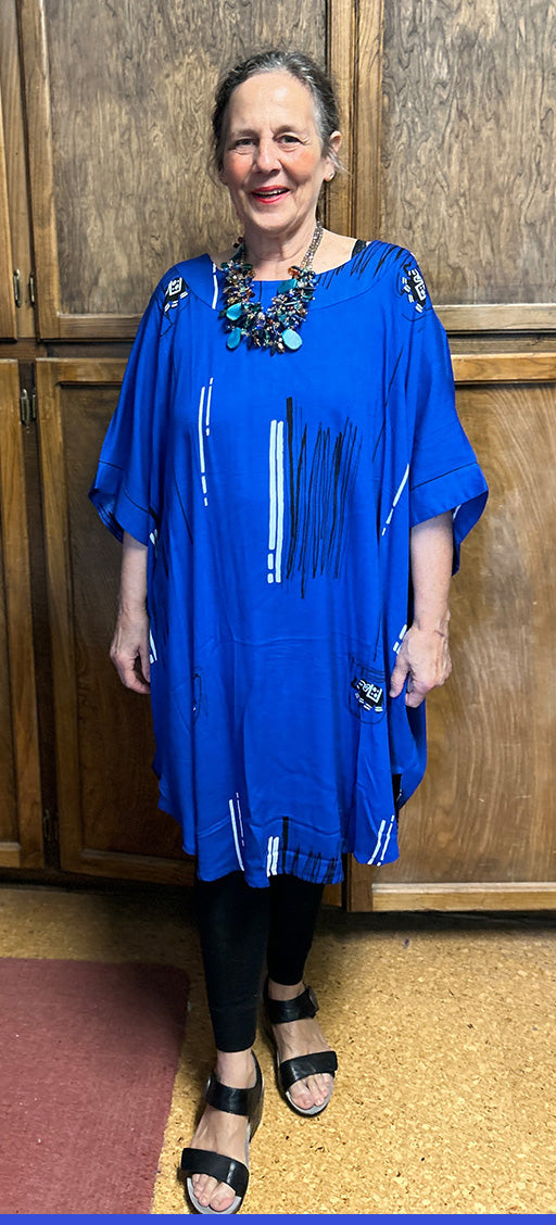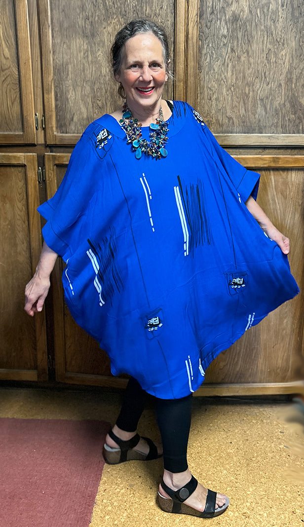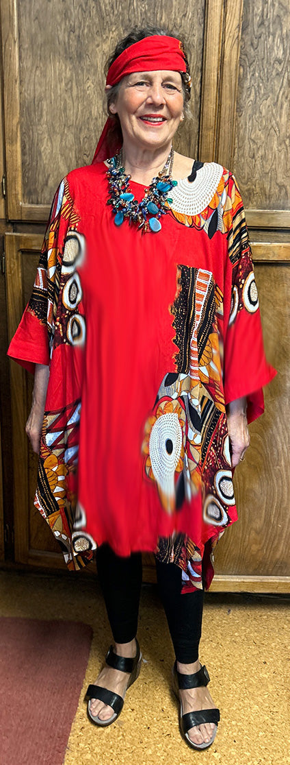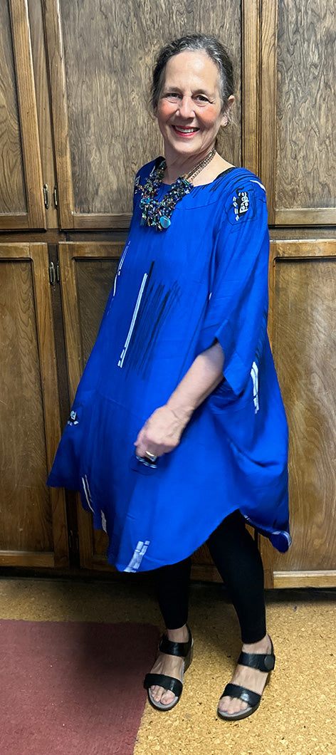 Size GuideRAYON HAND-WASH-DRIP DRY ONE SIZE FITS SML-5X+ • Bust 54" • Upper Arm 20" • Hips 80" • Length 48" Plus short-sleeve Dress Batik'd by artisans each one different and...