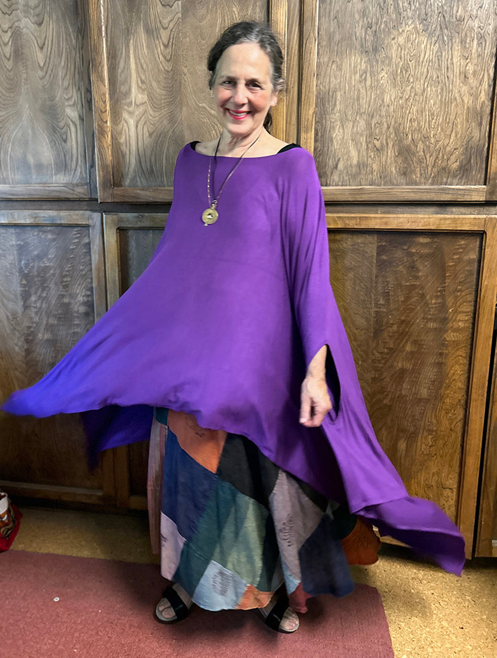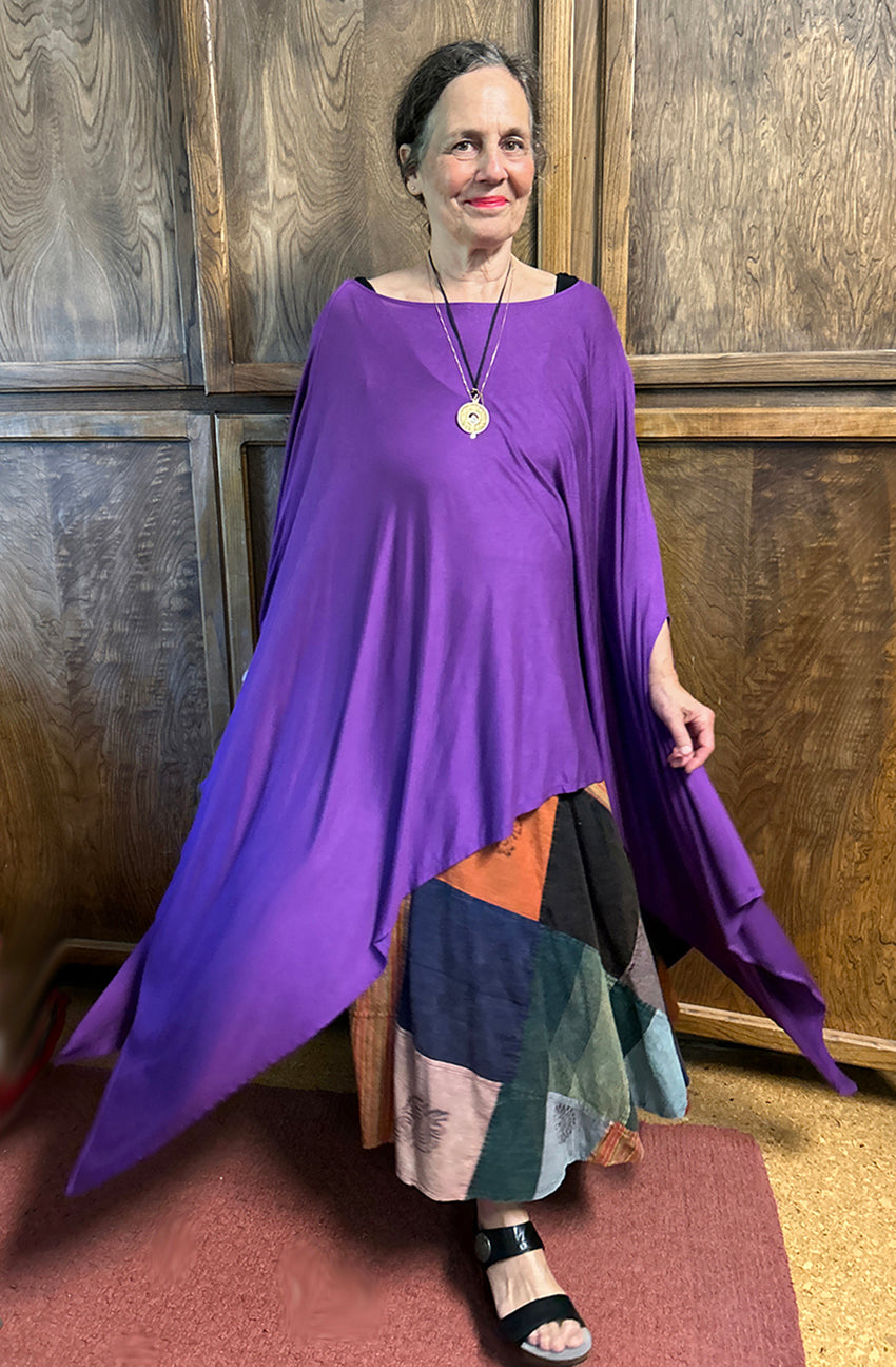 Size GuideBatik Stretch Only One Fun Top Slip into effortless comfort and joyful color with this one-of-a-kind batik top! Hand-dyed in deep jewel tones of teal, plum, and rust, the spiraling...