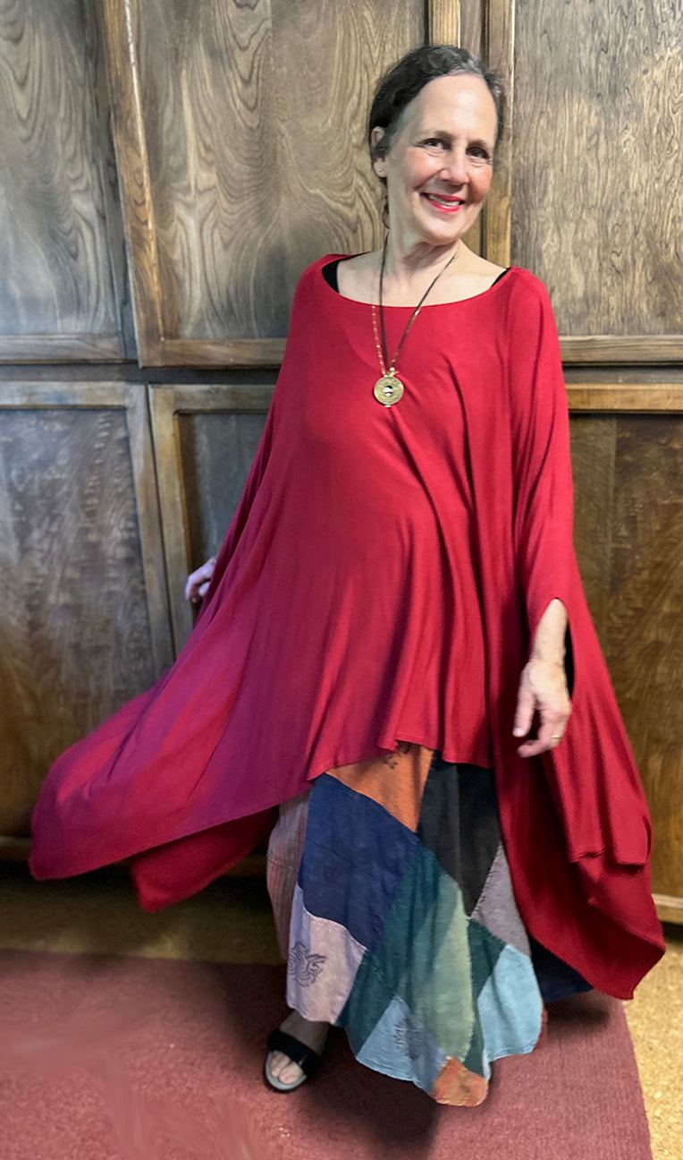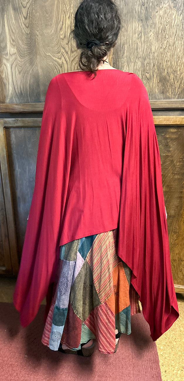 Size GuideRed Burgundy One-of-a-KindONE SIZE FITS SML-9X BUST 100" LENGTH: 28:-39" Introducing the Oversize Flamboyant Ruana, a breathtaking fusion of fashion and free-spirited boho charm. This radiant and voluminous garment transcends...