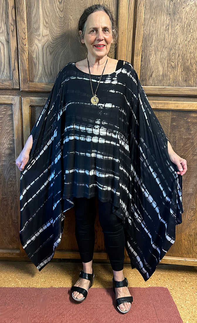 Size GuideNew Arrivals! One of a kind poncho tops - make a statement. ONE SIZE FITS SML-9X BUST 100" LENGTH: 28:-39" Design details: scoop neck, poncho design with armholes (so...