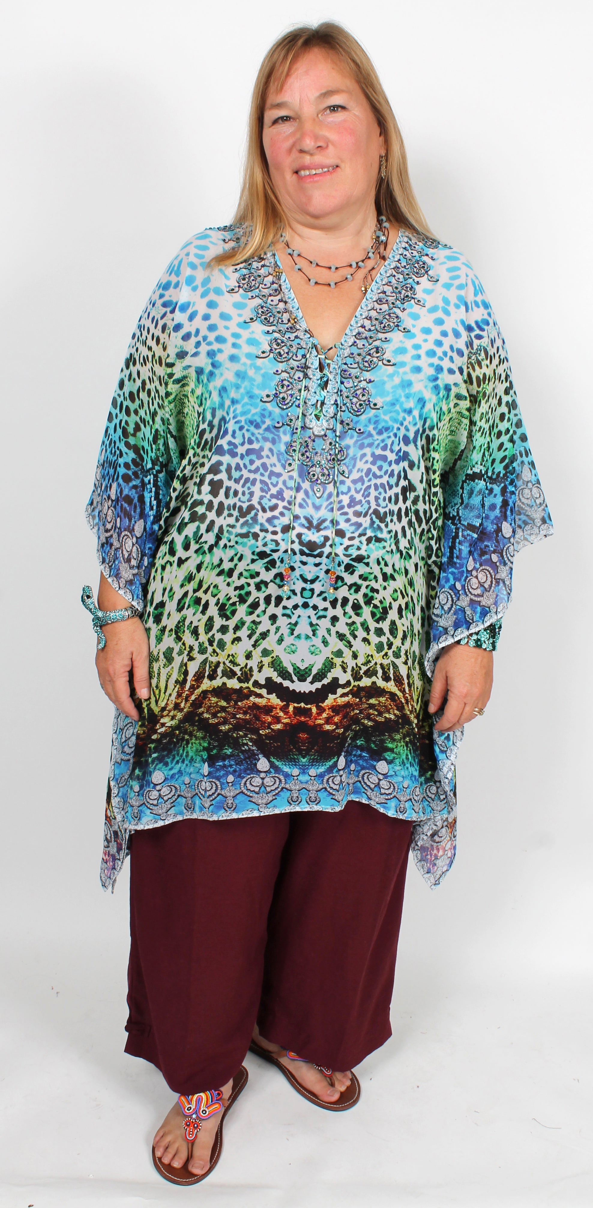 Size Guide93% Rayon 7% Spandex - Machine Wash Cold LABEL SIZE 2X FITS SML-4XBust 54" - 64"Upper Arm 26"Hips 70"Length 31" Beautiful new tops, perfect for dinner parties, events, opera and gallery...