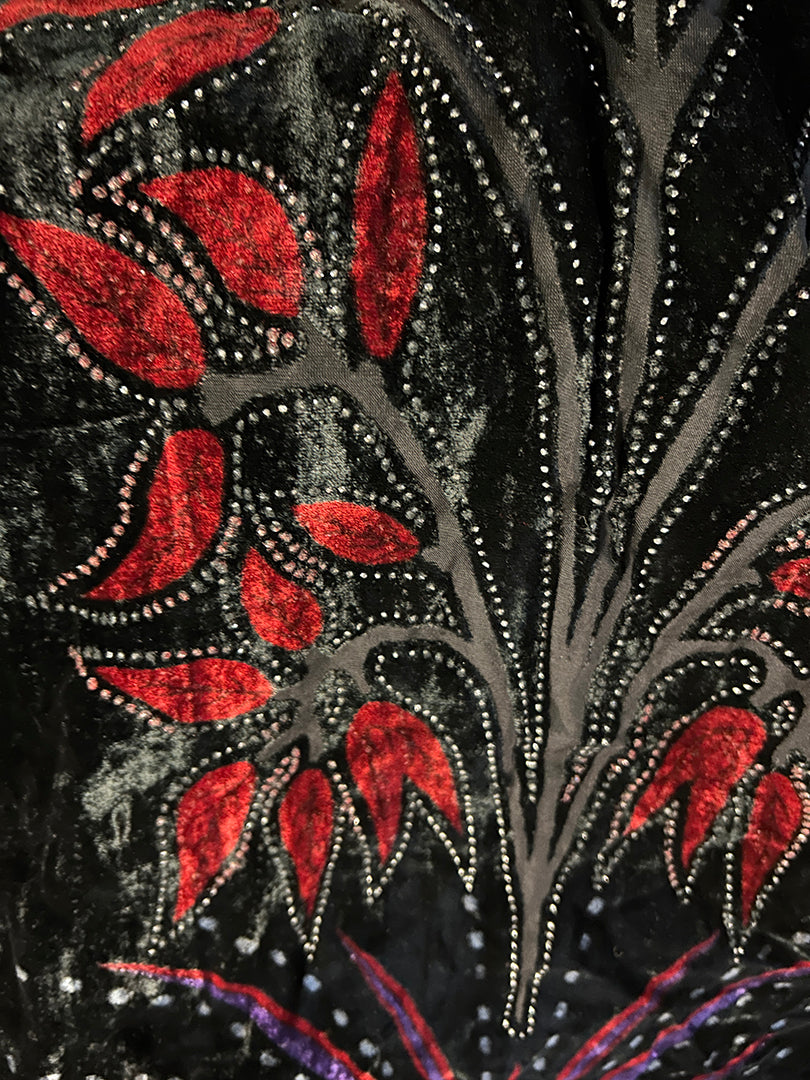 Measuring a generous 20" x 70", it drapes easily as a shawl, wraps twice at the neck, or floats long and slender for that boho-goddess sweep. The silky velvet hand feels soft and cozy on the skin while the bold red leaf motif brings a strong, creative statement to any SunHeart outfit.